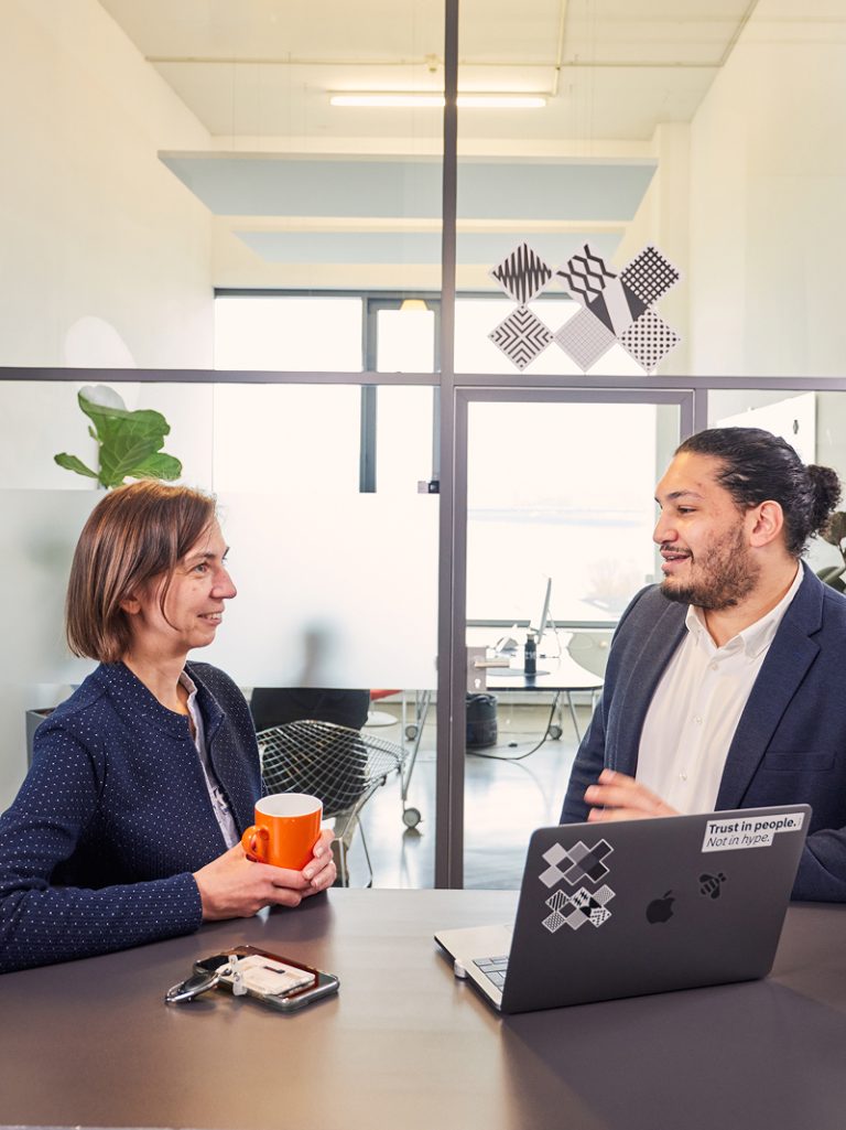 IBM iX and METRO collaboration on transforming customer experience globally. Two professionals engaged in a discussion, highlighting the focus on enhancing customer interactions.