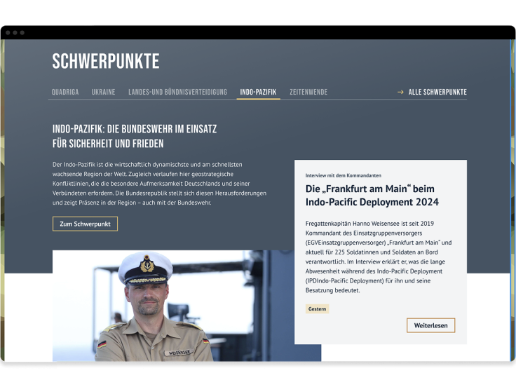 Im Frühjahr 2024 startete das Rebrush-Projekt. Das Ziel: redaktionelle Schwerpunkte neu setzen, die Tonalität weiterentwickeln und bundeswehr.de visuell wie funktional an die Anforderungen der Zeitenwende anpassen –